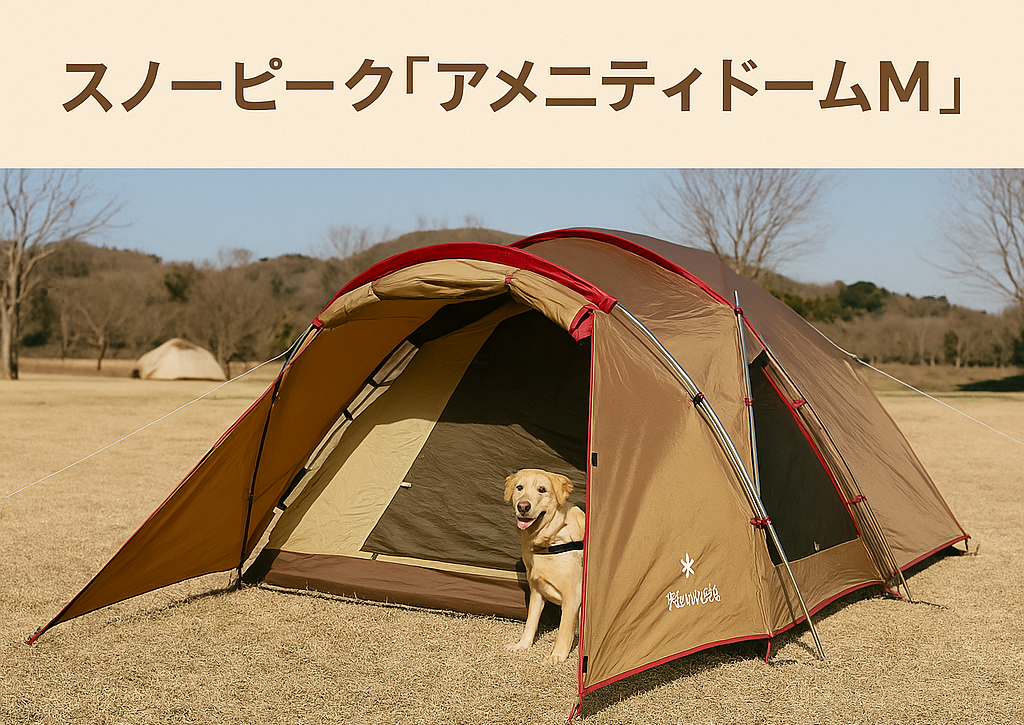 スノーピークの定番テント「アメニティドームM」は、犬連れキャンパーにも根強い人気を誇るモデル。